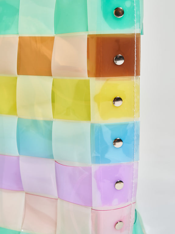Meet Atra, the peak-of-summer version of our luxurious Selvy bag. Crafted from woven crystal PVC straps in tangy and candy color tones, it features a detachable lining for those who prefer to keep their secrets out of sight. With natural webbing