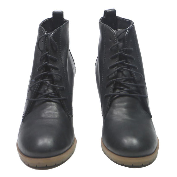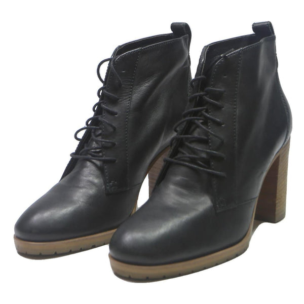 These elegant womens boots from 1937 are crafted from smooth black leather, featuring a lace-up front for adjustable fit and style. The ankle boots have a clean and simple design with a sturdy stacked block heel in a natural wood tone that adds height and sophistication.