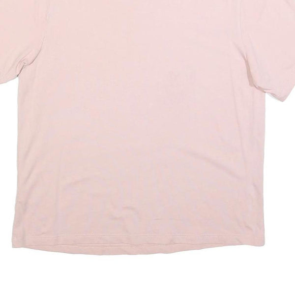 This Adidas womens T-shirt features a soft pink body with a contrasting white crew neckline, displaying the classic Adidas Trefoil logo in white embroidery on the chest for a subtle yet iconic branding detail. It is crafted from a comfortable cotton blend fabric that offers breathability and ease of wear.