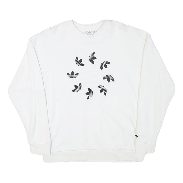 This Adidas womens sweatshirt comes in a crisp white colour featuring a unique circular arrangement of the Adidas trefoil logos in black on the front. The design places emphasis on classic branding with a stylish twist. The Adidas wordmark and trefoil logo also appear discreetly on the wrist cuff for added brand detail.