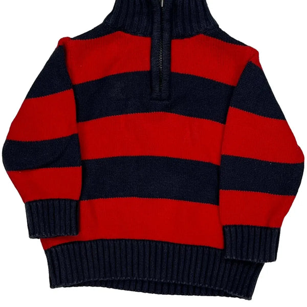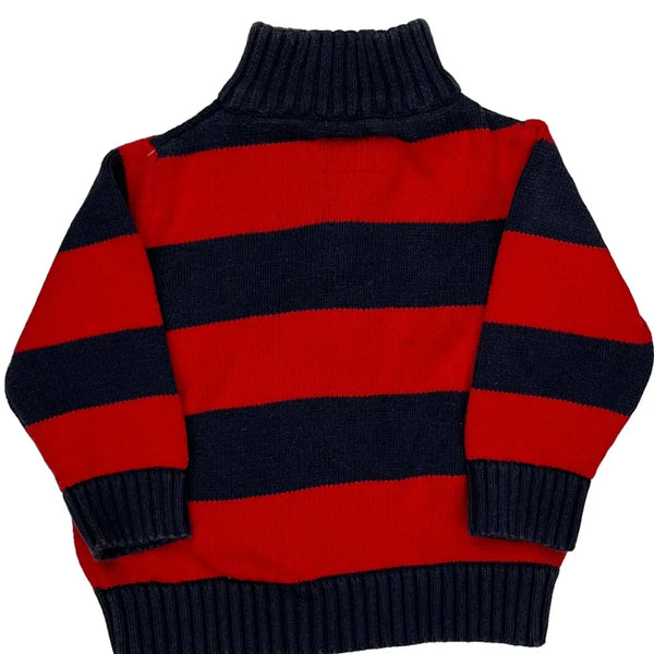 Red And Navy Striped Rugby Shirt With High Neck And Zipper.