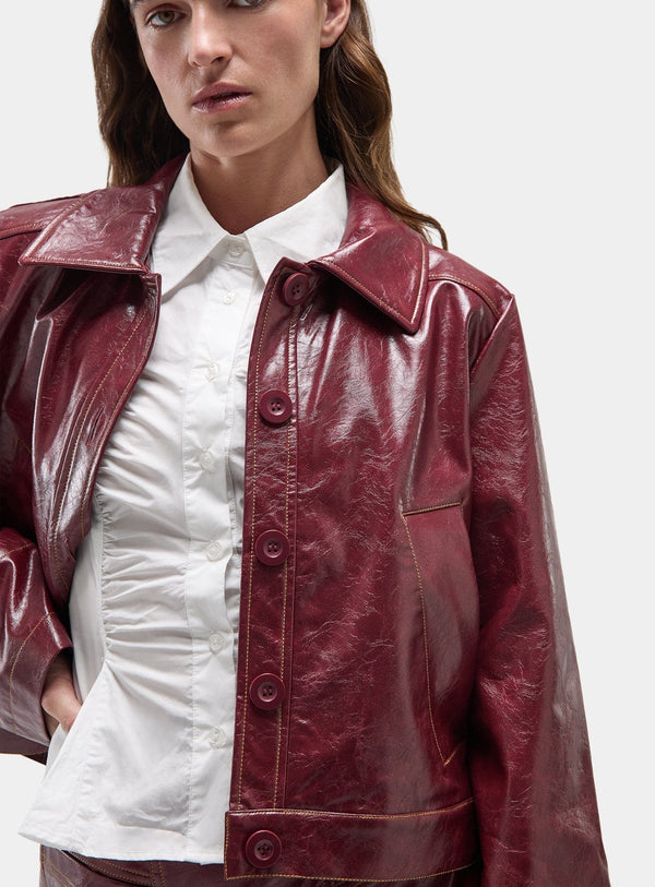 Cropped vegan leather jacket. Lapel collar and long sleeves. Front pockets and button-up front