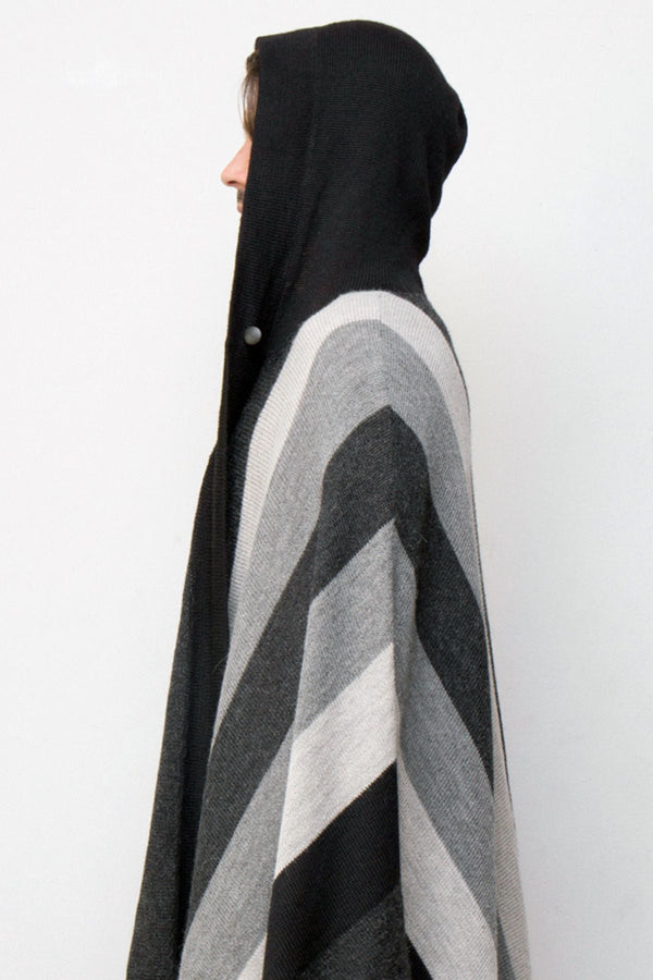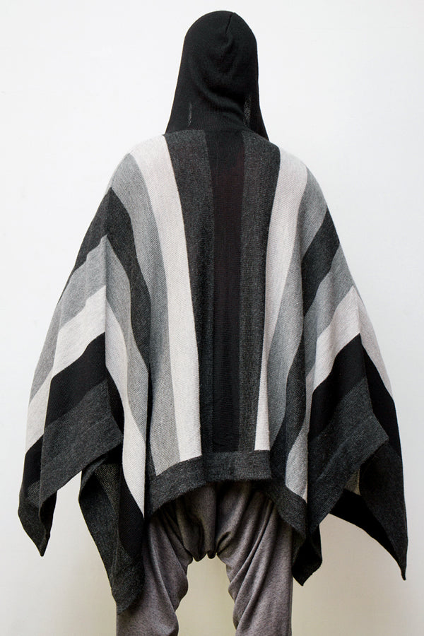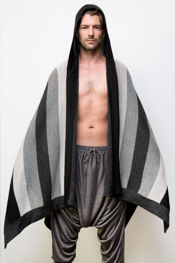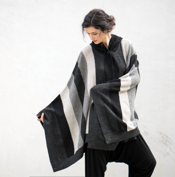 ARZÉ's alpaca hand loomed striped poncho with hoodie in perfect neutral greys feels and looks so chic and has a perfect medium weight. This awesome poncho is unisex both for men and women and goes perfectly over anything, shown here over our harm pant in hemp.