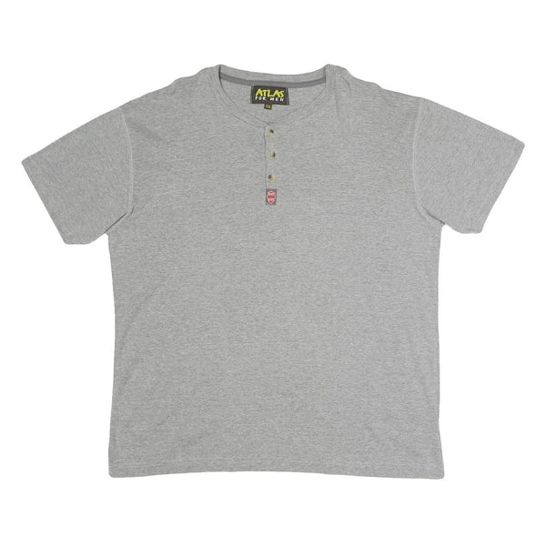 This men's T-shirt by Atlas For Men is crafted in a soft cotton blend fabric in a versatile grey colour. The garment features a classic short sleeve design with a distinctive henley neckline that includes a button placket with three buttons for adjustable style and comfort. A small branded patch is sewn just below the buttons, adding a subtle detail to the plain front.