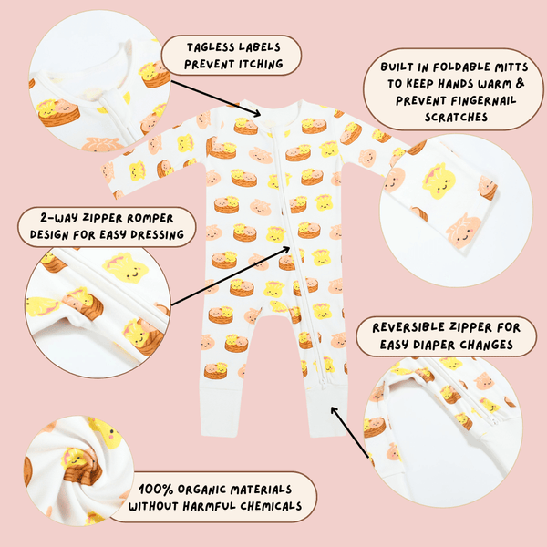 This is what dreams are made of! Our iconic Dim Sum print is now available in our new buttery soft bamboo blend! Our romper comes with a reversible zipper and convertible add-ons to ensure a tailored fit for your baby's needs at each growing stage, making them perfect for day or night! The chemicals and dyes used by many clothing manufacturers can irritate your baby's delicate skin. To combat this issue, we ensure that the texture of our fabric is as smooth and gentle as it can possibly be against your baby's sensitive skin.