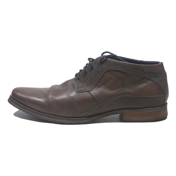 These BUGATTI mens boots feature a dark brown leather upper combining smooth and textured panels for stylish contrast. The lace-up design offers a secure fit, accented by the subtle bugatti branding embossed on the side. The shoes have a rounded toe and a stacked heel sole providing durability and elegance.