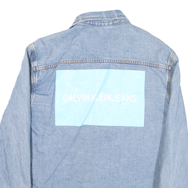 The back prominently displays a large light blue rectangular patch with "CALVIN KLEIN JEANS" printed in white, adding a distinctive brand statement to this casual staple. Made from a comfortable cotton blend, this jacket offers a relaxed fit perfect for layering over casual outfits.