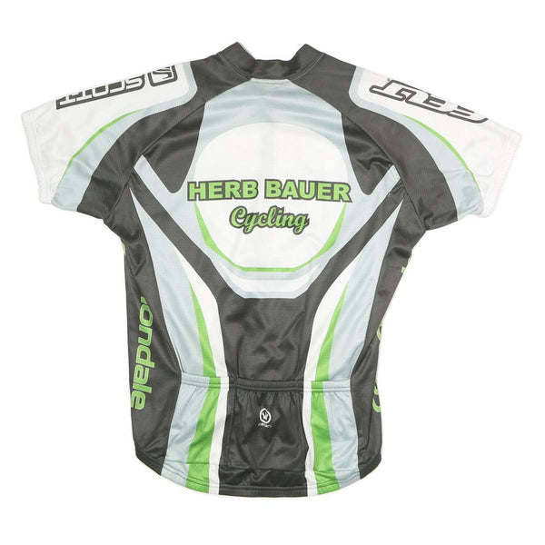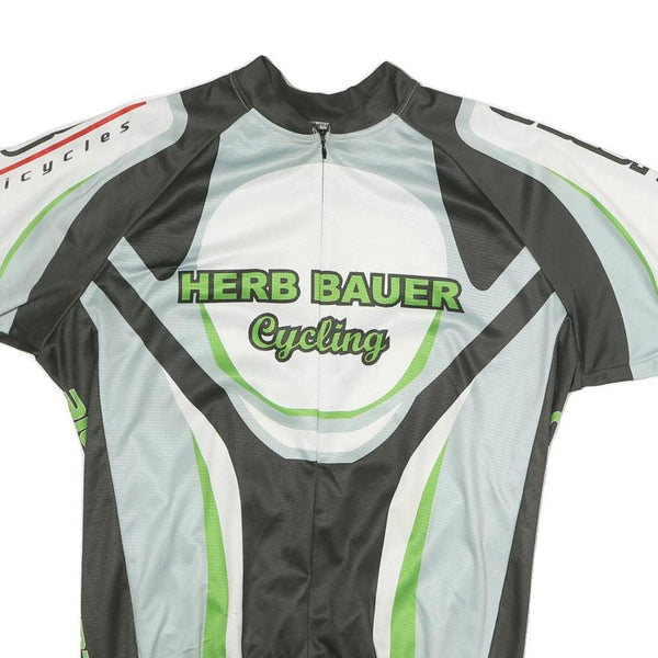 This men's Canari cycling T-shirt features a dynamic black, green, grey, and white graphic design with prominent "HERB BAUER Cycling" branding on front and back. It includes additional sponsor logos on the sleeves and sides, crafted from lightweight polyester fabric. The fabric has a smooth, breathable feel ideal for active sports.