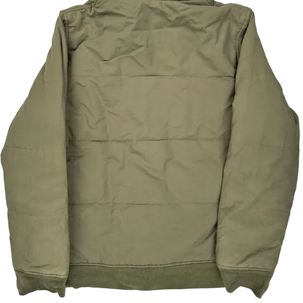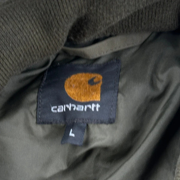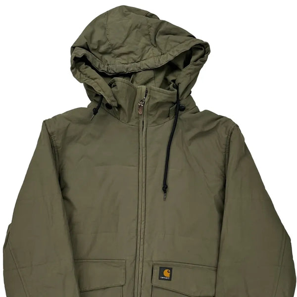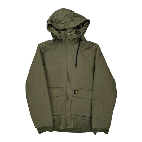 Olive Green Carhartt Jacket With Hood And Zipper Closure.