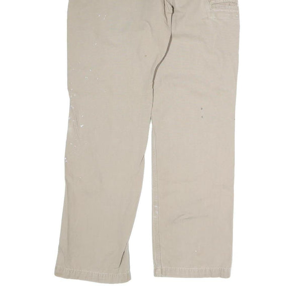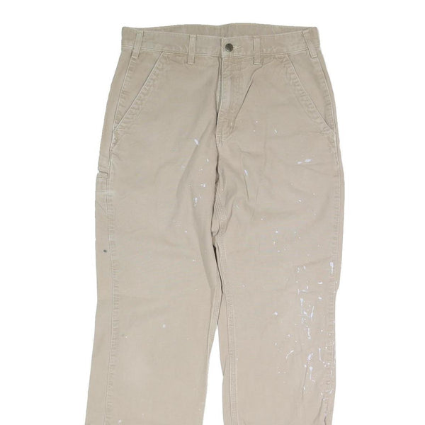 These mens Carhartt trousers are crafted from a sturdy cotton blend fabric in a versatile beige shade. They feature a classic straight leg cut with a regular fit, suitable for everyday wear or work environments. The trousers show visible paint splatters and slight wear consistent with fair pre-loved condition.