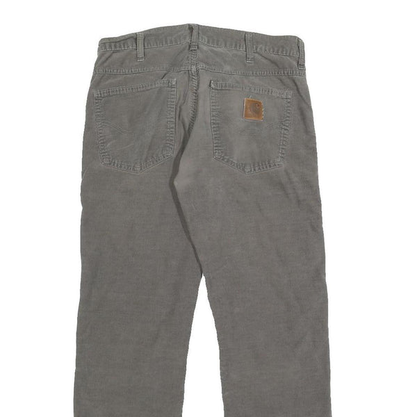 These Carhartt mens trousers are made from cotton in a soft grey shade with a corduroy finish that adds texture and warmth. The front features classic five-pocket styling with a zip closure and button fastening. The rear pockets include a signature branded leather patch on the right, underscoring the workwear heritage of the brand.