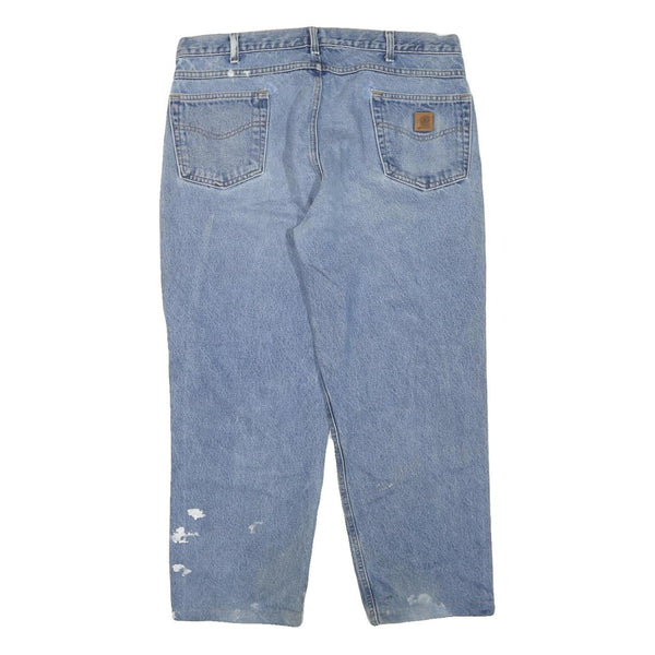 The jeans present visible signs of wear including faint stains and paint marks on the legs and ankles, consistent with previous use but retaining a rugged appeal typical of Carhartt's utility style. These jeans are ideal for buyers seeking practical, timeless denim with authentic vintage wear.