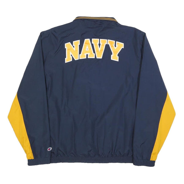 This Champion mens jacket features a primarily navy blue body with bold yellow panels on the lower sleeves. The front chest bears a yellow 'N' with the word 'NAVY' printed across it, while the back prominently displays a large 'NAVY' print in matching yellow. The jacket is finished with a ribbed collar accented by yellow stripes and a full zip closure.