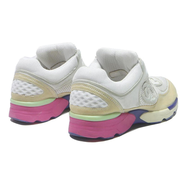 These CHANEL trainers feature a striking colour combination including white mesh and synthetic uppers with beige suede overlays. The iconic CC logo is prominently displayed on the side in white, blending elegantly with the shoe's fresh, summery palette. The sole includes pops of vibrant pink, pale green, and purple, adding a youthful and contemporary flair.