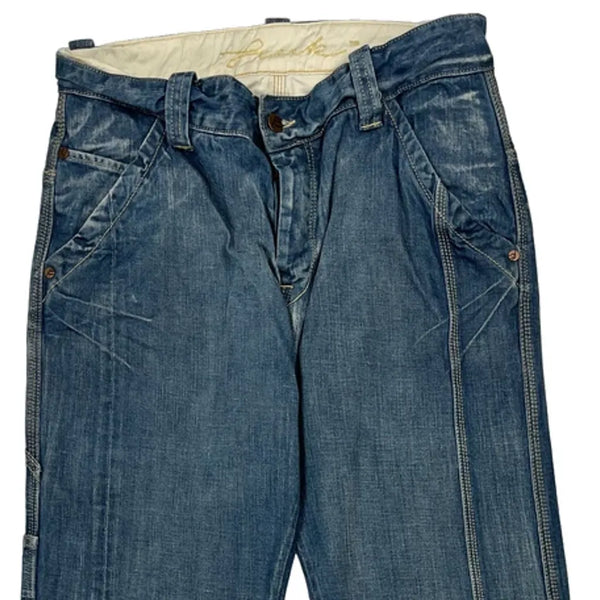 Faded Blue Carpenter Jeans With Double Knee And Multiple Pockets.