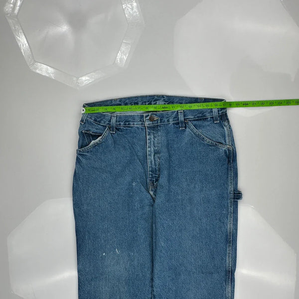 Dickies Carpenter Jeans, fit a 34″ Waist and 30″ inseam.