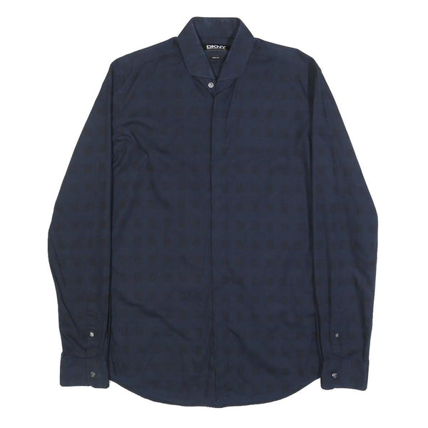 This DKNY mens shirt showcases a sophisticated navy blue tone with a subtle check pattern woven into the fabric, creating a refined textured effect visible under light. The shirt features a pointed collar and a concealed button placket with the top button visible at the neck for a clean, modern look. Cuffs are buttoned with small branded buttons adding a discreet designer touch.
