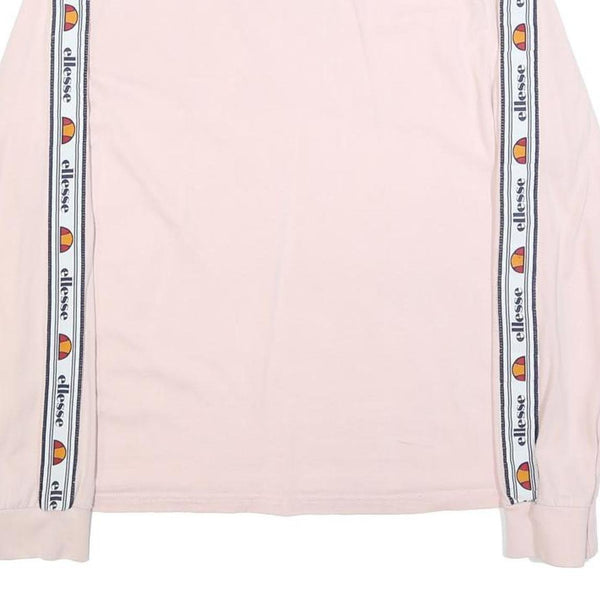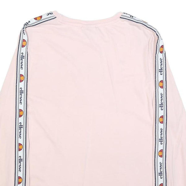 This ELLESSE womens T-shirt features a soft pink colour with prominent white, red, and orange ellesse logo print across the chest. The long sleeves are accented with branded taping running from shoulder to cuff down both arms, adding sporty detail. It has a classic crew neck and ribbed cuffs for a snug fit.