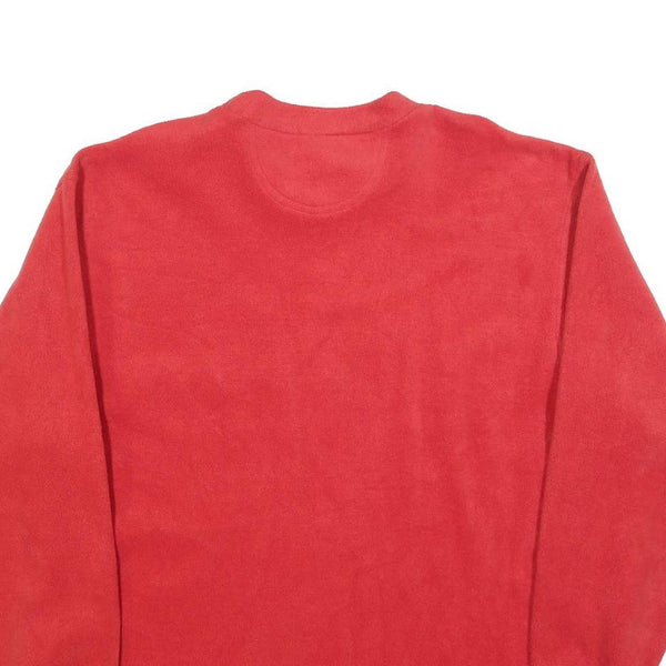 Made from soft polyester, the fabric has a smooth texture and offers lightweight warmth, making it suitable for layering or standalone wear. The jumper has a relaxed fit and moderate length, providing ease of movement and comfort for casual everyday use. The back is plain red with no additional detailing, emphasizing the minimalist style.