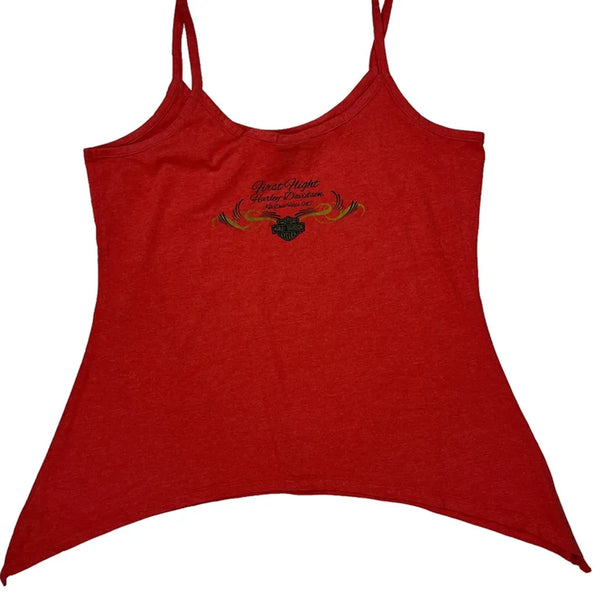 Red Harley Davidson Tank Top With Graphic Design On Front And Back.