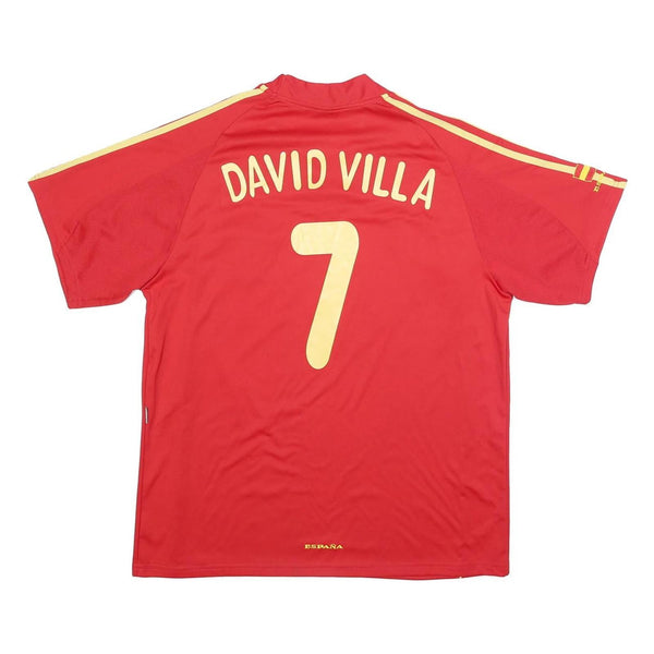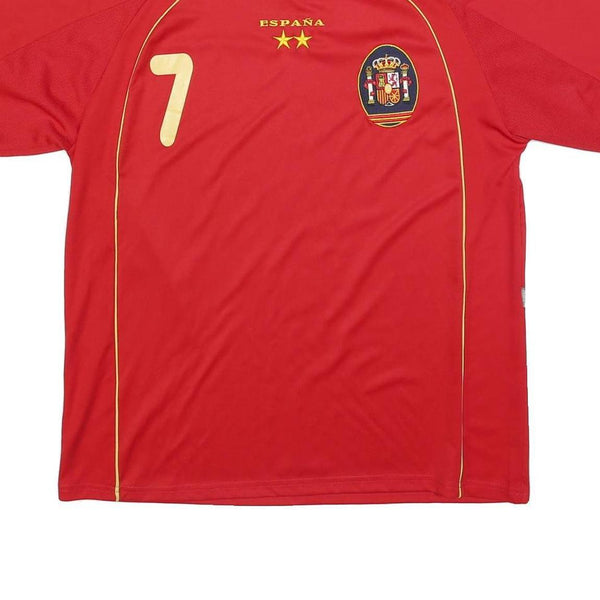 This vivid red Football Action T-shirt features the number 7 on the front and back along with the name David Villa printed on the reverse. The front bears two gold stars above the shield emblem and 'España' text, giving a bold and sporty look. Contrasting yellow piping outlines the front panel and continues as twin stripes along the shoulders and sleeves, accentuating the athletic style.