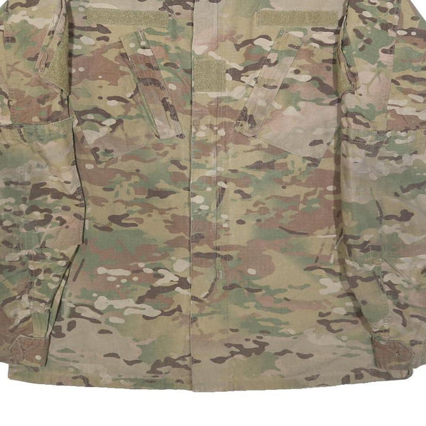 Constructed from durable rayon fabric, this jacket is built for resilience and wearability in active conditions. It presents a utilitarian style with excellent camouflage functionality and multiple practical features. It is a pre-loved item in good condition with some visible wear signifying previous use but no significant damage.