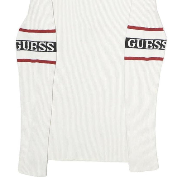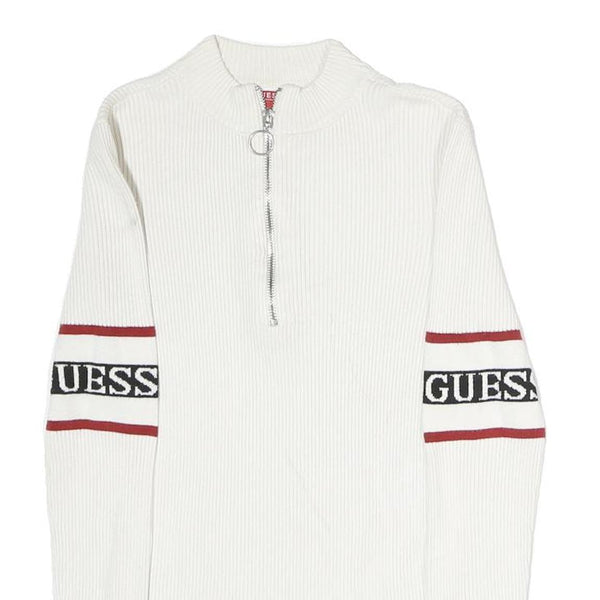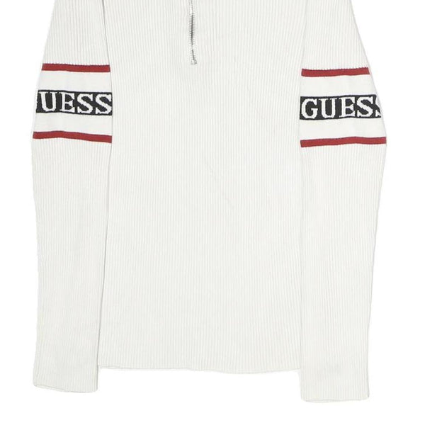 This Guess womens jumper is crafted in a pristine white cotton blend fabric with rib knit texture, offering a soft and comfortable feel. It features bold red and black logo bands with the brand name "GUESS" prominently displayed on both sleeves, adding a sporty and stylish touch. The pullover has a crew neck with a half zip closure and a silver metal ring pull for easy wear and added detail.