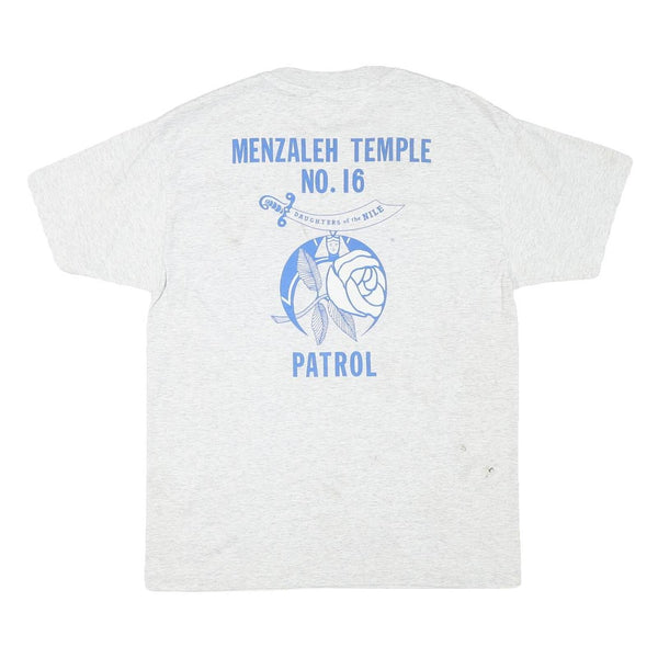 This Hanes Mens T-Shirt in grey features a vintage graphic on the front depicting a detailed blue steam locomotive with the word "SACRAMENTO" printed boldly underneath. On the back, it is adorned with blue text and graphics reading "MENZALEH TEMPLE NO.16 PATROL" alongside a circular emblem with a rose, a feather, and a curved sword banner stating "DAUGHTERS of the NILE".