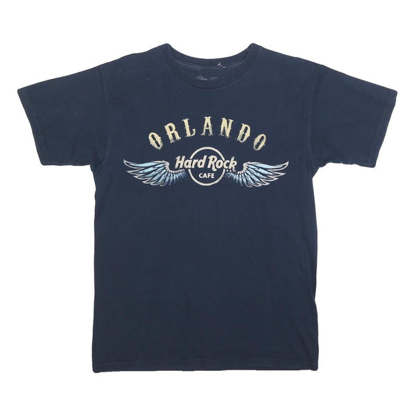 This Hard Rock Cafe men's T-shirt is a navy blue cotton blend piece featuring iconic branding from the Orlando location on the front. It has a worn vintage style print with "Orlando" text arched above the classic Hard Rock Cafe logo with wing graphics. The back displays a large graphic of a guitar with wings, the text "Hard Rock" and "1971," along with additional decorative and musical script elements, lending a strong rock music vibe.