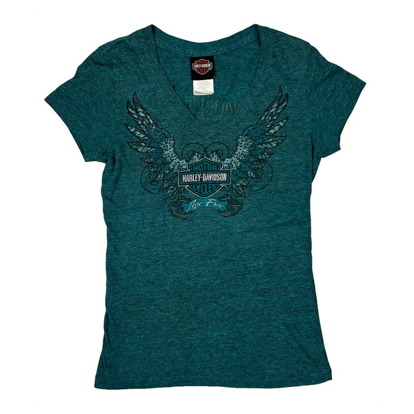 Teal Green Harley Davidson T-Shirt With Graphic Design On Front And Back.