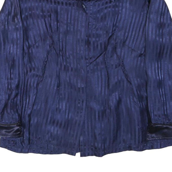 This womens shirt by HUONG TRAM features a deep blue colour with a subtle printed striped pattern that adds texture and visual interest. The satin-like finish gives the fabric a sleek, shiny appearance, enhancing its elegant look. The shirt has a traditional collar and long sleeves with matching cuffs, finished with a button closure hidden under the placket for a clean front.