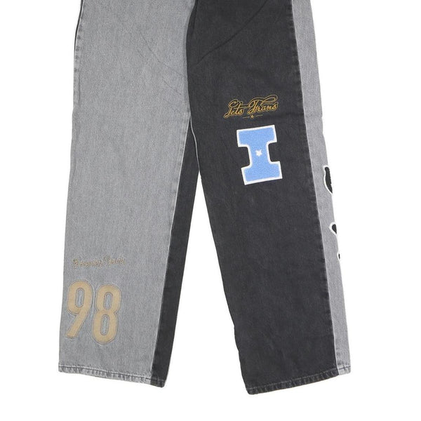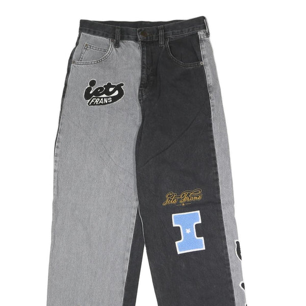 These IETS FRANS womens jeans feature a unique two-tone design in black and grey denim with embroidered and appliqué patches including the brand's name, the number 98, and additional styled text. The contrasting colours create a bold and fashionable look, perfect for statement casual wear.