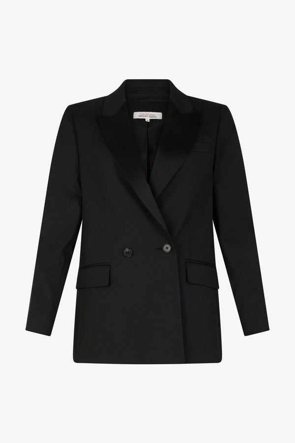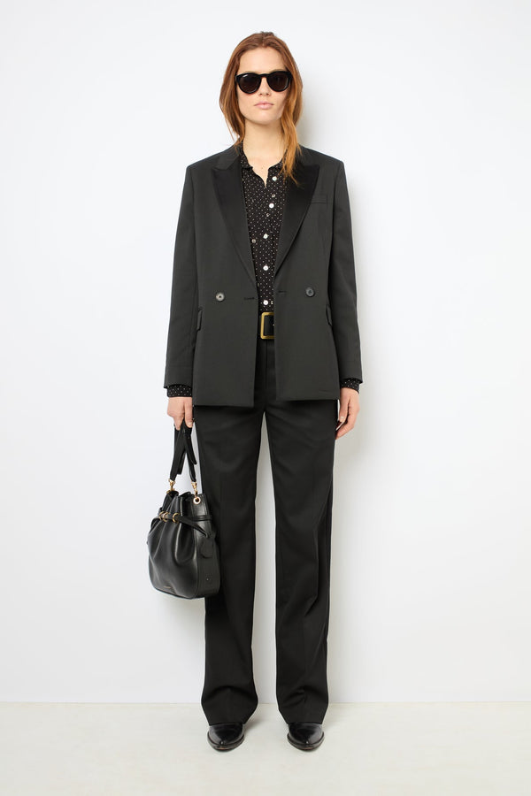 BLACK TUXEDO JACKET WITH SATIN COLLAR, ULTRA CHIC WITH MATCHING PANTS.