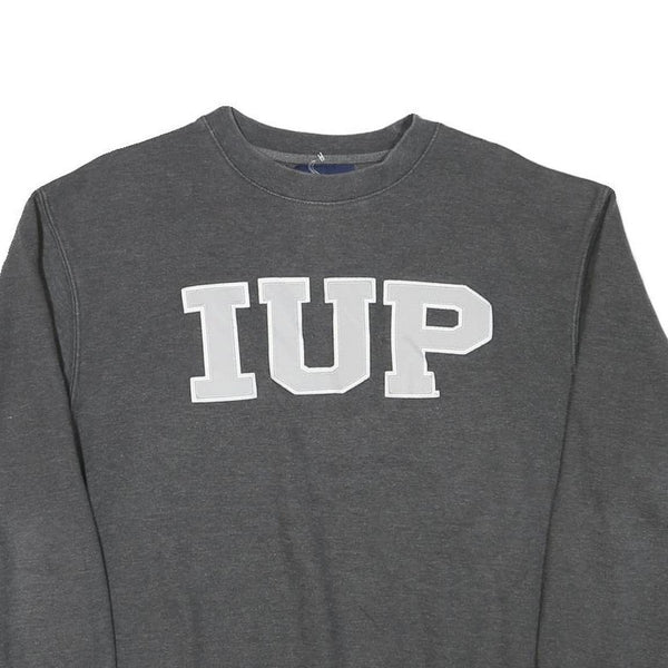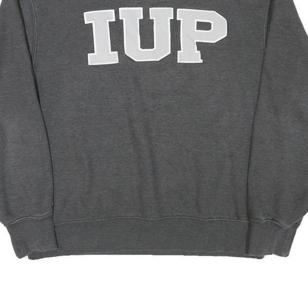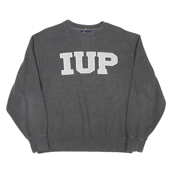 This JANSPORT sweatshirt is crafted from a soft cotton blend fabric providing comfortable warmth and durability. It features a crew neckline and long sleeves with ribbed cuffs for a snug fit. The primary colour is a solid grey, accented with bold white varsity-style applique letters spelling 'IUP' across the chest.