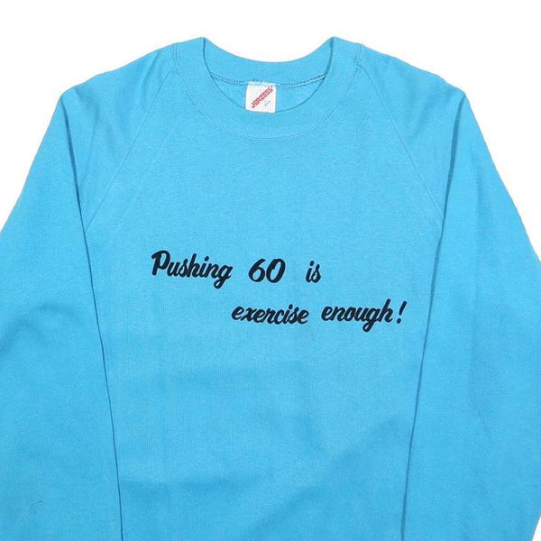 This womens sweatshirt from JERZEES features a bright blue colour with a fun ribbed crew neck and raglan long sleeves. Emblazoned on the chest in black script font is the playful phrase "Pushing 60 is exercise enough!", making it a charming and humorous piece for casual wear.