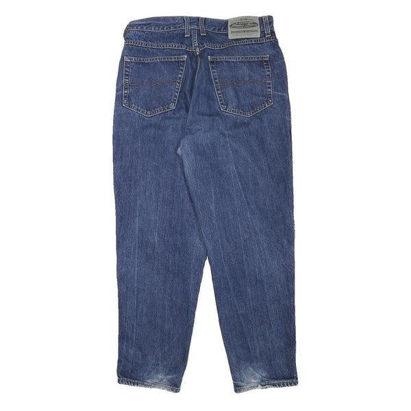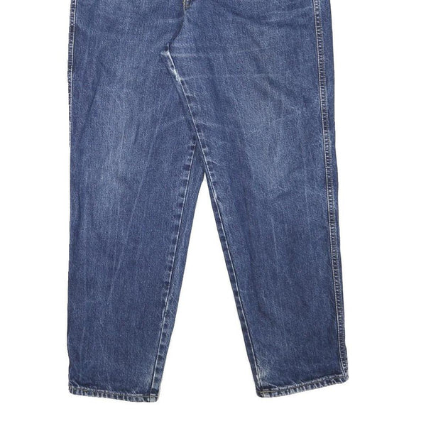The jeans have subtle fading and wear marks typical for their pre-loved condition, adding authentic character. They include tonal stitching details on the back pockets and a branded patch on the waistband, embodying a timeless casual style. The fit is relaxed through the hips and thighs, tapering slightly toward the ankle for modern comfort and ease of movement.