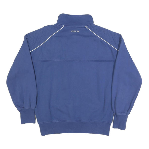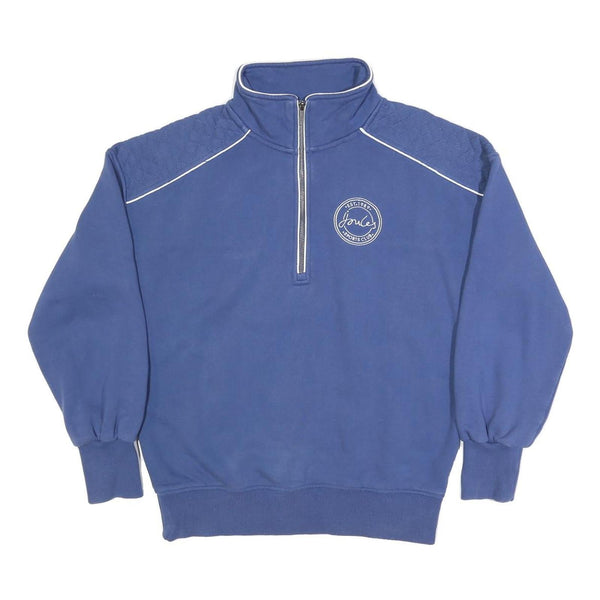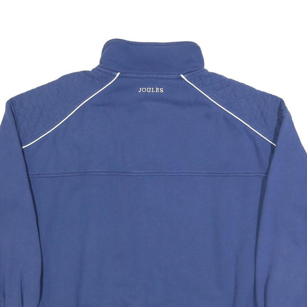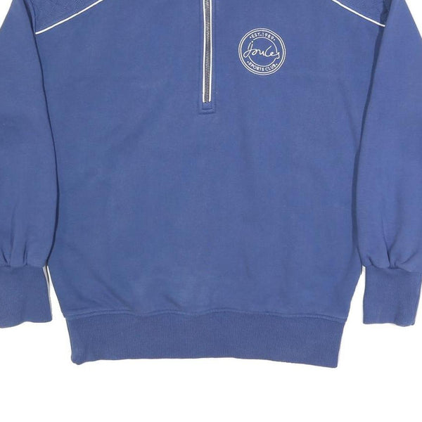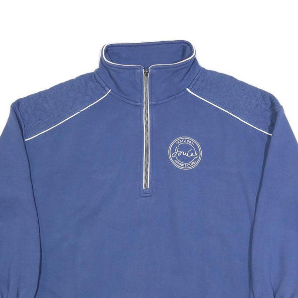 This Women's jumper by Joules is a stylish piece in a solid blue shade with subtle white piping detailing on the shoulders and collar edge. The front features a half zip neck with a silver zip, adding both visual interest and practicality for adjustable comfort. A circular Joules Sports Club logo is embroidered on the chest, and the brand name is stitched on the back near the collar, offering subtle branding.