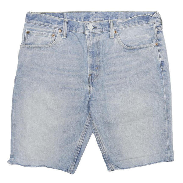 These LEVI'S mens shorts are crafted from cotton denim featuring a light blue wash with a classic five-pocket design. The shorts present a casual cut-off style with raw hems, giving them a relaxed and worn-in appearance. They secure with a button and zip closure at the front for practicality.
