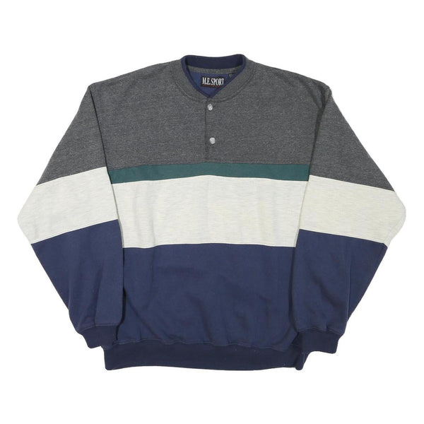 This M.E Sport sweatshirt features a stylish colour block design with horizontal bands of grey, teal, cream, and navy blue. It has a crew neck with a button detail on the placket, adding subtle interest to the neckline. The contrasting colours create a classic sporty look perfect for casual wear.