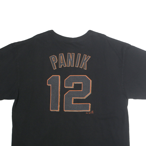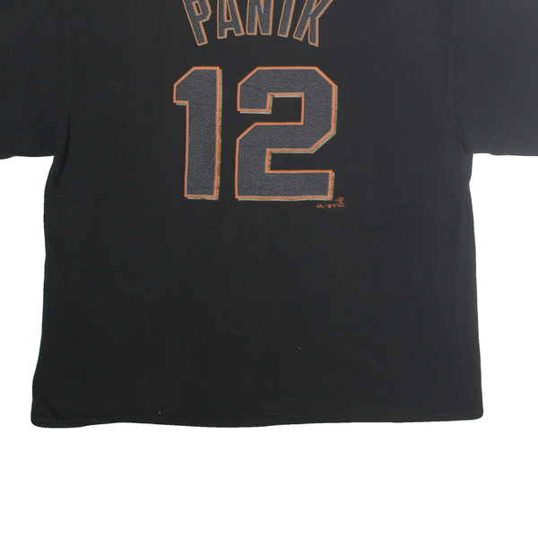This Majestic Mens T-Shirt features a bold black colour with the word "GIANTS" prominently printed across the front in outlined orange lettering. The rear showcases the name "PANIK" and the number 12, printed in matching orange and grey tones with a textured appearance. The Majestic logo is subtly placed above the front lettering, adding to the sporty aesthetic. The T-shirt is made from a comfortable cotton blend, offering a soft feel and breathable wear ideal for casual or sports-inspired outfits.