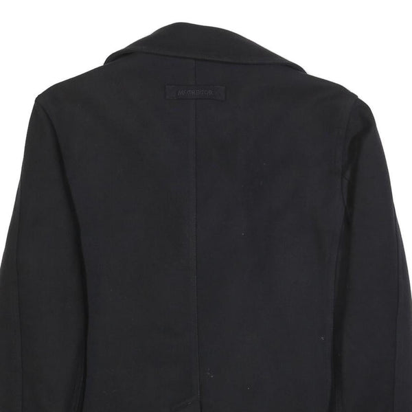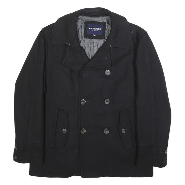 This Mens McGregor jacket presents a classic black colour with a plain pattern and a stylish button closure front. It has a traditional double-breasted style with prominent McGregor branded buttons. The jacket features a collared neck and two front flap pockets, all contributing to a timeless outerwear piece.