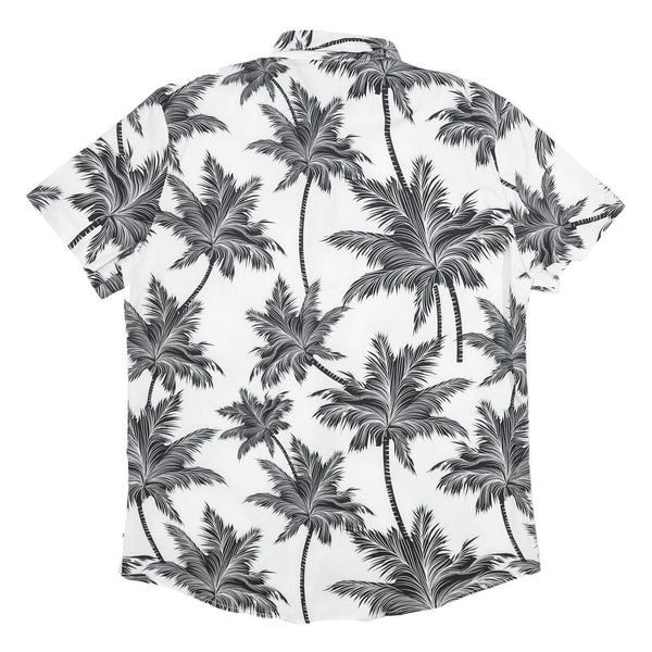This mens short sleeve shirt features a striking white base adorned with a black palm tree pattern, creating a bold yet relaxed tropical vibe. The palm leaves and trunks are rendered in fine detail throughout the fabric, giving the shirt an eye-catching all-over print.