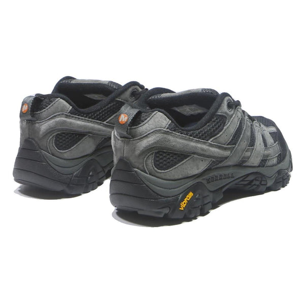 These MERRELL Moab mens trainers feature a grey and black colourway crafted from durable synthetic material with breathable mesh panels. They present a rugged low top hiking style designed for outdoor use with sturdy rubber soles showcasing Vibram branding for enhanced grip and durability.