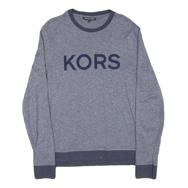 This Michael Kors mens jumper is crafted from a soft cotton blend in a dark blue shade, giving it a classic and versatile appeal. It features a plain knit design with a prominent branded "KORS" print across the chest in a matching blue colour, adding a subtle but stylish logo detail. The ribbed crew neck, cuffs, and hem provide contrast in a solid navy blue, lending a polished finish to the casual look.