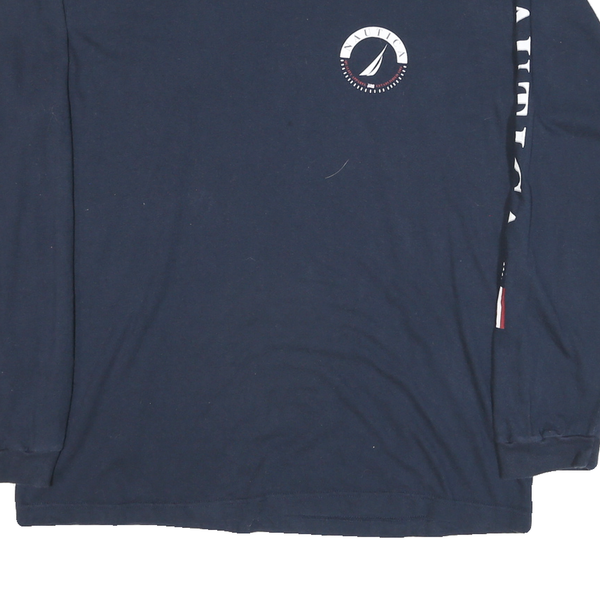 This Mens Nautica long sleeve T-Shirt boasts a classic navy blue colour with a small circular Nautica logo featuring a sailboat on the chest. The right sleeve is prominently printed with NAUTICA lettering and an American flag-inspired graphic near the cuff. Made from a comfortable cotton blend fabric, this T-shirt offers a soft and breathable feel.
