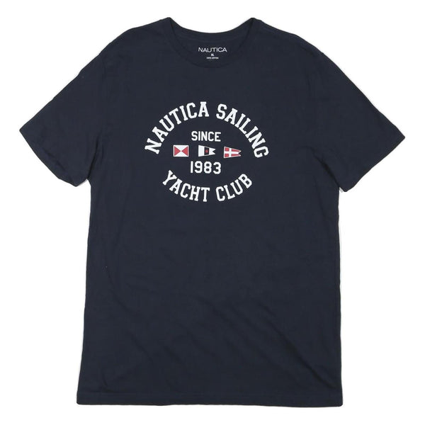 This Nautica mens T-shirt features a deep navy blue cotton blend fabric with a bold white graphic on the front. The print showcases "Nautica Sailing Yacht Club Since 1983" encircling three colourful nautical flags, adding a classic maritime touch. The back is plain navy blue for a clean, versatile look.