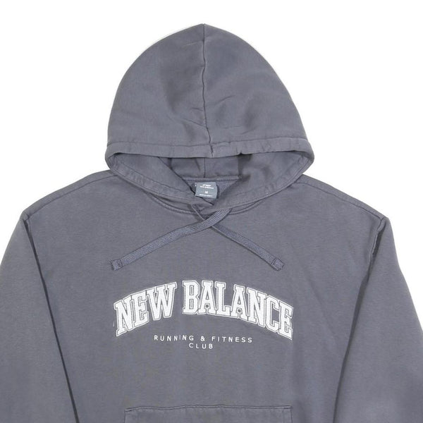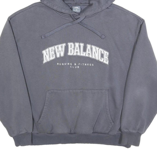 This New Balance womens hoodie comes in a muted grey shade featuring a bold white New Balance logo and the text "Running & Fitness Club" printed across the chest. The pullover style has a comfortable hood with drawstrings and a classic kangaroo pocket for practicality and warmth.