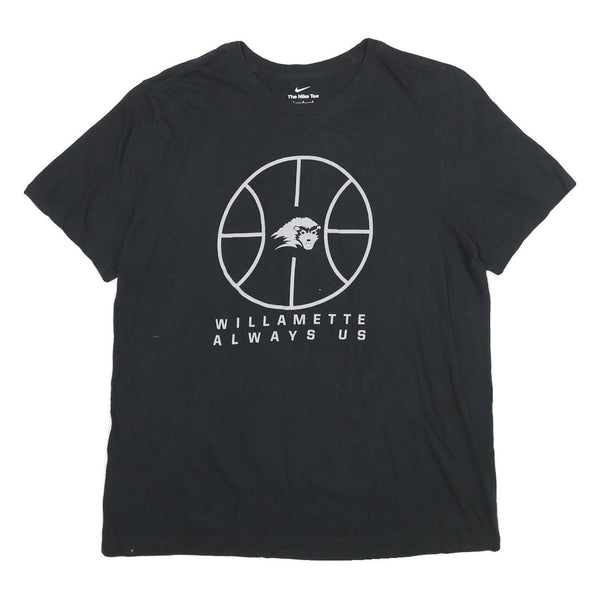 This Nike men's T-shirt features a classic black colour with a striking light grey graphic on the front. The print shows a stylised basketball design with a fierce animal head at the centre and the text "WILLAMETTE ALWAYS US" beneath it, giving it a sporty and collegiate vibe. The back is plain black with a small white Nike swoosh near the neckline.