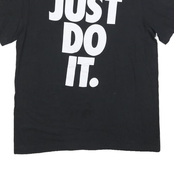 This Nike T-shirt features a bold black colour with the iconic "JUST DO IT." slogan printed in large white uppercase letters across the front. The classic Nike swoosh and branding is subtly printed inside the neckline.