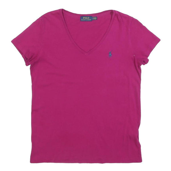 This vibrant pink Polo Ralph Lauren womens T-shirt features a classic V-neckline and short sleeves, ideal for casual and stylish wear. The shirt displays the iconic Polo Ralph Lauren pony logo embroidered on the left chest in contrasting blue, adding a subtle signature branding detail.